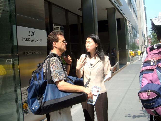 据来自多伦多的法轮功学员介绍,广大纽约市民不但在法轮功学员讲真象活动中了解了法轮功、了解了发生在中国的迫害,更有一些有识之士向法轮功学员提供帮助和建议。纽约当地的一名大学教授,与法轮功学员共处了一个小时,了解真象后,他主动告诉法轮功学员们共和党代表最集中的地点,以及重要人物聚会的地点。看到法轮功学员们很安静,他说,“你们要大声喊,让那些人听到你们的声音,看我的。”于是,他就冲着来往的共和党代表大声喊,“请帮助停止对法轮功的迫害!!”他说,“要象纽约人那样,更强硬些!”