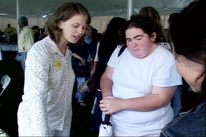 法律学院的艾米利不时的向驻足停留的人们介绍法轮功