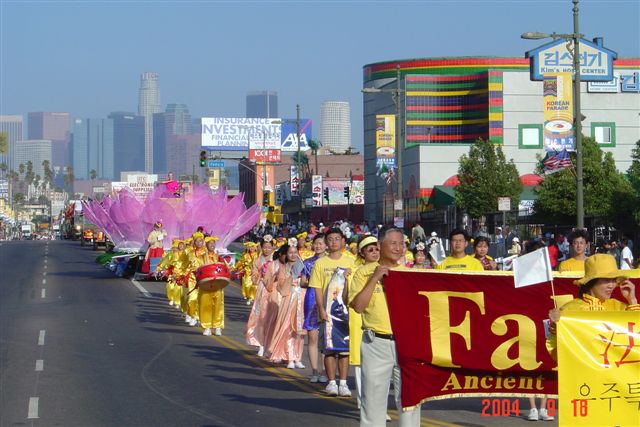 【明慧网2004年9月20日】2004年9月17日下午,洛杉矶韩国城举行盛大游行活动庆祝第31届韩国节。韩国节设立主旨是倡导族群和谐,弘扬韩国文化。它鼓励不同族裔走在一起,促进各族文化的交流,增进临近社区居民的相互理解。今年庆祝的主题是多元与团结。据估计,在洛杉矶大约有10万韩国人,大多集中在韩国城。韩国城附近也不乏非洲族裔、西班牙裔及环太平洋族裔的居民。
