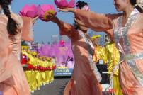 洛杉矶大法学员今年第一次报名参加,他们的队列以一面以韩文和英文写成的横幅开道,上书“法轮大法——古老的身心修炼”。法轮大法学员以优美的舞蹈、传统的腰鼓、以及高雅盛大的花车赢得道路两旁观众的阵阵掌声。游行结束后,学员队伍分别获得游行一等奖、花车一等奖以及腰鼓三等奖。
