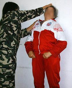 图1-1:马三家教养院队长黄海燕打法轮功学员石胜英10多个耳光,石胜英的脸被黄海燕的指甲划破,眼里也充了血。黄海燕又向下按石胜英的两肩呈蹲下姿势。