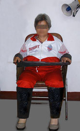 【明慧网2004年9月20日】(图片为演示照片,实际“铁椅”等刑具和当时的迫害程度要严重得多。图中红白相间的运动服是马三家教养院强制法轮功学员穿的“号服”。)