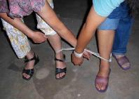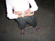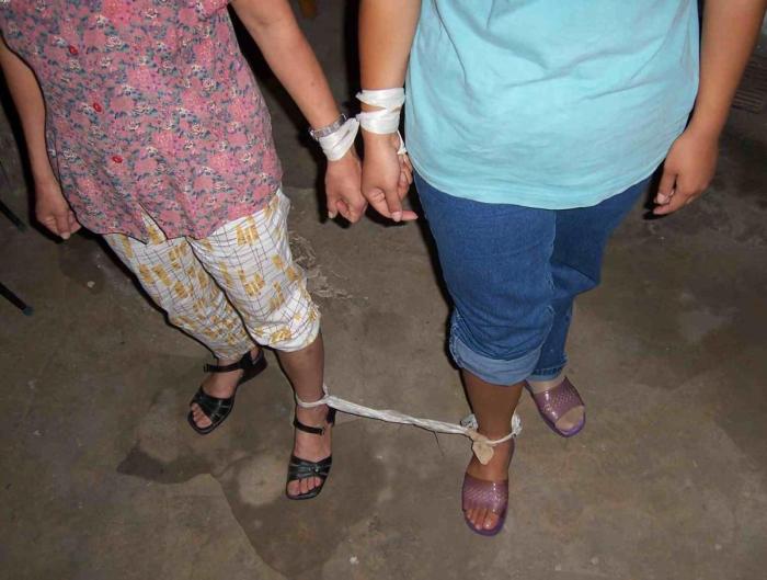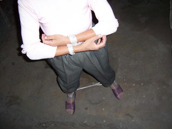 1、长期把单个法轮功学员的手和手用手铐铐起来、脚和脚用脚镣铐起来,此种铐刑致使法轮功学员的手无法活动,只能用一只手,连吃饭、上厕所都很困难。如演示图1(用塑料绳演示手铐、脚镣),