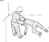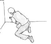2、长期把单个法轮功学员的脚用脚镣铐起来,并把两只手抱住脚镣的链子再铐手,如演示图2,这种铐刑只能弯腰走路,立不起躺不下,吃饭、上厕所无法自理,必须要同修帮助。