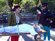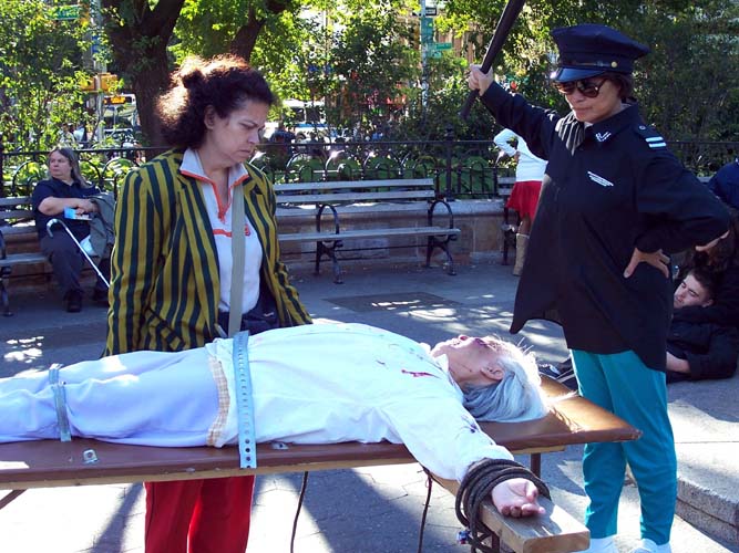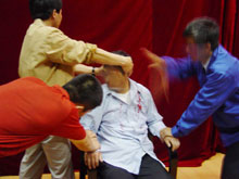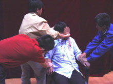 一位扮演警察的女学员说,开始扮演警察的时候,我在做警察打学员的动作,做着做着,我的眼泪就一直在那儿掉,幸好我带了个大的墨镜,人们看不太清,但还是挡不住,眼泪就掉出来了。后来我想我就是要把迫害真象告诉人们。在中国发生的迫害实际上比我们演示出来的还要严酷。就把眼泪制住了。我希望人们能够通过酷刑展明白真象。