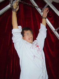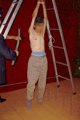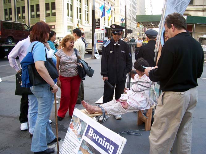 反酷刑展是法轮功学员今年新采用的一种揭露迫害、讲清真象的方式。通过真人模拟演示出江氏集团迫害法轮功学员的种种残酷手段。虽然展示的惨烈程度远不能与大陆法轮功学员实际承受的相比,但仍然令观者为之震惊。