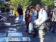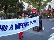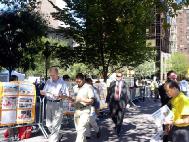 在百老汇大道和春季街(Spring)举办的图片展旁,有三个骑自行车的人说他们已经听说过在中国发生的迫害了,也听说过法轮功了,他们说他们是从法国来的,他们都在请愿信上签上了名字。其中一位女士说,她在中国劳改研究会工作,很了解中国劳改营里的虐待人的情况。他们希望我们成功。