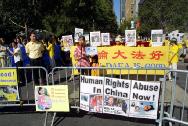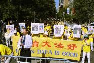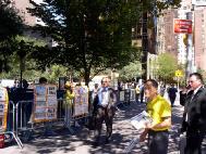 中午至下午两点,在曼哈顿第三大道上,从43街到57街,法轮功学员用“帮助停止迫害法轮功”、“法轮大法好”等黄底蓝字的小横幅、各式各样揭露迫害讲清真象的展板以及他们坚定的信念和不屈的精神组成了一道“勇气长城”。
