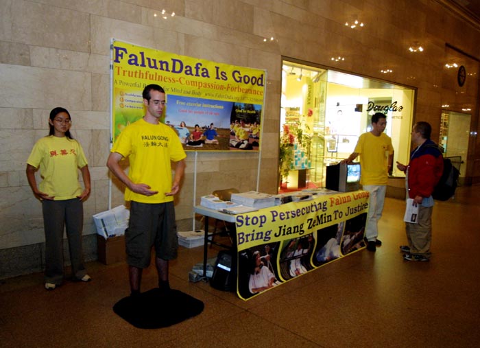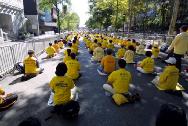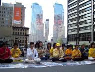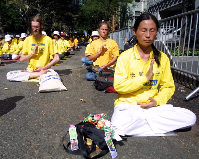 早晨9点,法轮功学员开始了在联合国广场前的集体炼功。自99年7月江氏集团发动了这场荒唐无理的迫害以来,五年多来,法轮功学员们曾无数次来到这里揭露迫害,呼唤正义良知。学员们的请愿一如既往的安宁祥和,舒缓的炼功音乐,庄重的炼功场面,展示出的是法轮功学员们的和平与坚毅。