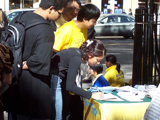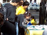 他说,有许多人在要求中国政府停止迫害的请愿簿上签下了他们的名字。他说在刚刚的三个小时内,仅在他的签名簿上就签满了三、四页。有位女士还要把签名簿带到学校让那里的师生签名。