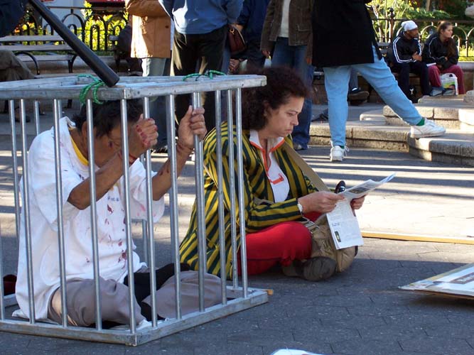 Edith女士又走到蹲小笼的地方坐下来,想感受一下被关在小笼子里的痛苦。她说,这样被关着受折磨,人怎么能这样对待自己的同胞?接着,她又走到写有“正发生在中国”的横幅后面,用手帮着举着横幅。