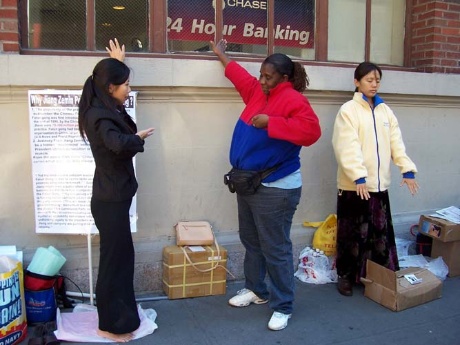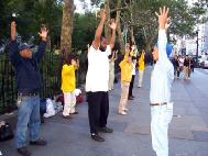 一天的活动快要结束时,在台湾弟子坚守的42街和第七大道上,来了一位有趣的人。他的名字叫比利。他是来学功的。他说两周前他从洛杉矶大法弟子的手中接了一张真象传单。然后他就自己学功。他也没有上网去找消息,他只是按着真象传单上的动作比划。他只会两个动作,那就是两个握球拧掌的动作。就从这两个动作中,他已经感觉到很强的能量流了。所以,他炼习这两个动作已经炼习了两周了。