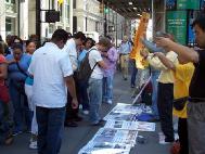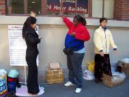![]() 路人感受学员的承受 | ![]() 与酷刑受害者同坐 | ![]() 路人主动帮助拿横幅 |