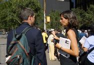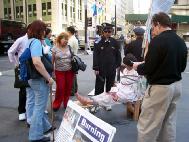 学员们在百老汇大道和自由街(Liberty)街角进行了酷刑展和图片展。这里靠近曼哈顿金融中心,周围有许多餐馆和食品摊位。许多在金融公司上班的职员中午都要经过这里买午餐。