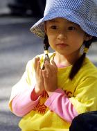 更有一帮小朋友围着学员要真象CD。有的还读着摊位上的横幅“法轮大法好”!