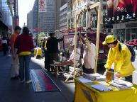 有一对夫妇来自悉尼,他看见我们讲真象的活动时就说:“在悉尼我们也看见过的。”悉尼的同修就说:“就是为了让江氏集团早日停止这场镇压,我们来到了这里讲真象。”那对行人夫妇听了学员的耐心讲述后,非常感动,一连说谢谢,祝你们成功。