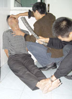 众恶人将大法弟子按于墙角,再用胶皮棒敲击小腿的胫骨,疼痛难忍。