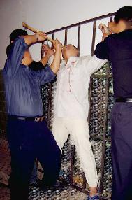 将大法弟子双手分开铐吊于铁床上,两脚分别铐于铁床底处,再将木椅倒置让其坐于椅子的铁筋上。恶徒将一长木棍支于肛门处。身体重量集中在木棍和铁筋上,长时间受此刑极为痛苦。或将大法弟子手脚均铐住,将其长时间罚坐于一固定悬空的木棍上。