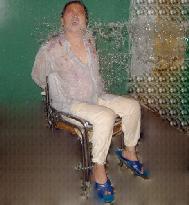 北京海淀区看守所将一大庆大法弟子挤于墙角,再将椅子置于腿部。几人踩住椅子按住头,一人用胶皮棒抽打其脚心。
