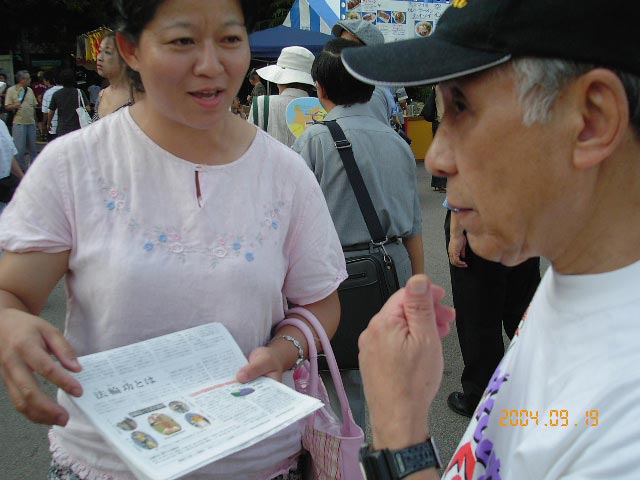 【明慧网2004年9月24日】2004年9月18日和19日,在日本东京都千代田区日比谷公园,熙熙攘攘的人群赶来这里正在举办的TOKYO ASIAN CITY FESTIVAL 2004 〈东京亚洲城市节日〉。在小音乐堂对面的广场上,有亚洲各国出场的饮食、服装、杂货等摊位,人们为着各自的喜好穿梭在其间。有一位在东京经营三家饮食店的干练大方的女士,亦在这人头攒动的场地里摆出了自家的饮食摊位,所不同的是,她家的摊位前除了设有供客人使用的桌椅,还摆有一个独一无二的法轮功真象资料架,单是文字就有日文的、中文的、英文的、韩文的,CD有中文的、日文的、有图象的、有音乐的,还有日文的五套功法图片文字介绍的彩色书签。一台电视和CD机不停的交替播放着天安门自焚和历史的审判及大法真象歌曲。