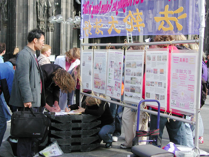 有两个德国中学生细细看过我们的真象展板后,又问了一些问题:这是怎样一种功?为什么受到迫害?如何做可以制止迫害?我简要解答了他们的问题后告诉他们:如果你们愿意的话,可以在征签表上签名反迫害。他们问签名管用吗?我说是管用的。我又告诉他们:如果他们能转告亲朋好友中国正在发生的这件事,知道的人越多,就越有助于尽早结束对无辜者的迫害。两个学生签了名,并发自内心的祝我们成功后才离开。