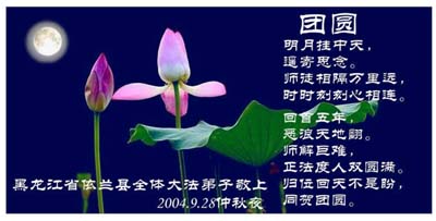 【明慧网2004年9月26日】中秋节被称之为团圆节,是一个传统隆重、美满、温馨的节日,也是一个充满着诗情画意的美好的节日。诗人曰:“万里无云境九州,最团圆夜是中秋”。(唐 殷文圭《八月十五夜》)中国人自古到今把阖家团圆认为是天伦之乐,一家人能团聚在一起,在他们心里的分量的确不轻。尤其中秋夜圆月当空,若有哪一位家人不能与之聚首,在家庭成员的心里总有一份失落的凄凉遗憾之感,于是,轻轻的将一块月饼为其存留,以示合家团圆。