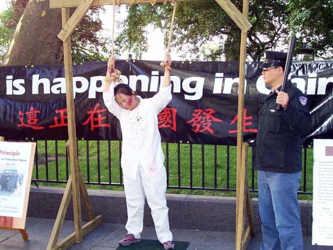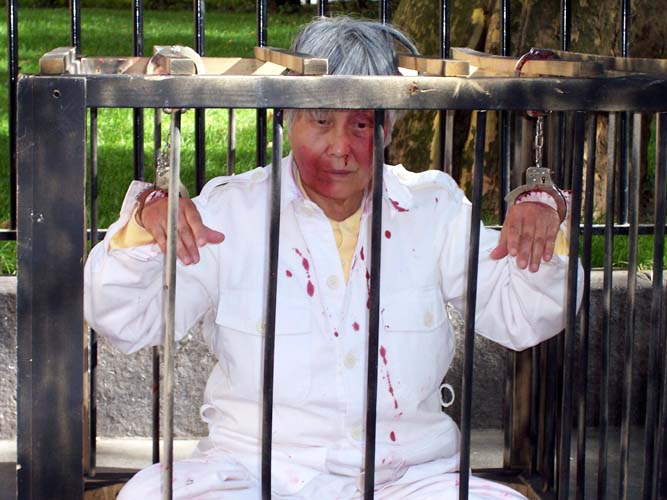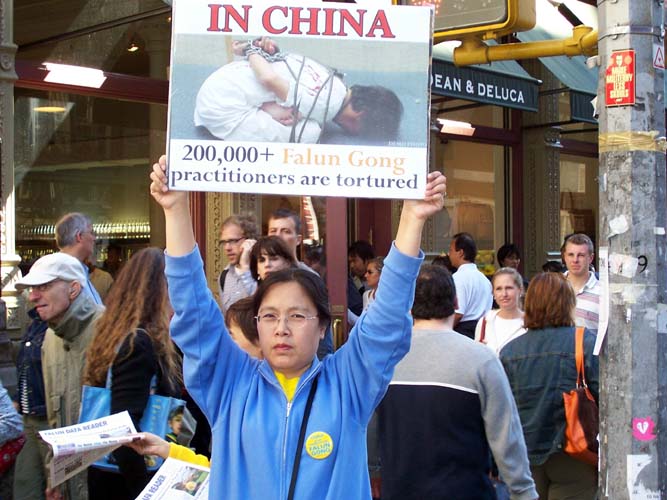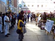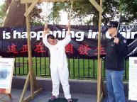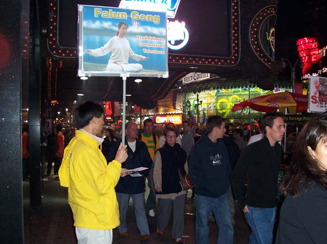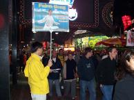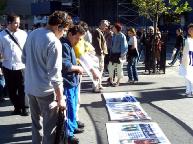 一位路人说,“法轮功炼功打坐是和平的,我不明白中国[江氏集团]怎么会这样对待你们。”学员告诉她说,人们炼功来强健身体,并按照真善忍做好人,很多人觉得功法好,都希望学炼李洪志老师传出的法轮功,但是中国当时的领导人江××出于小人的妒嫉心,容不下人们这样做,结果它利用权力发动了这场迫害。导致至少一千多人被折磨致死。