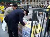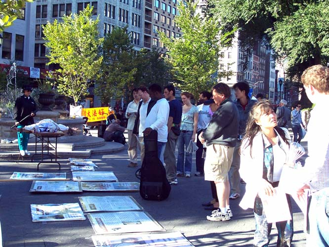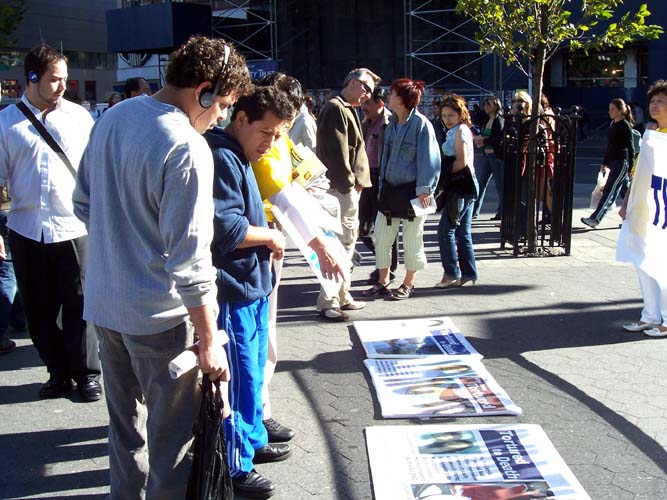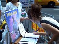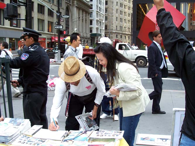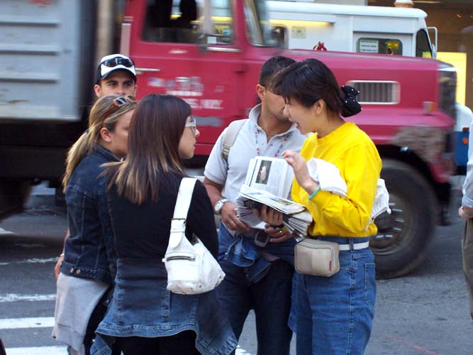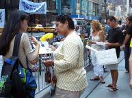 许多纽约人在了解了真象后,有的主动拿出钱来要提供帮助。有的人问学员怎么能够提供帮助。还有的人问,你们只要我们把真象告诉我们的朋友,写信给政府官员,这样就能停止屠杀吗?学员说,如果一个人做了坏事,杀了人,他最怕的就是让别人知道。如果全世界的人都知道江××发动的这场残酷的迫害,中国的迫害就会停止。而且人们也不会愿意与邪恶的人打交道。路人听了后说,“我明白了,我会告诉我的朋友。”