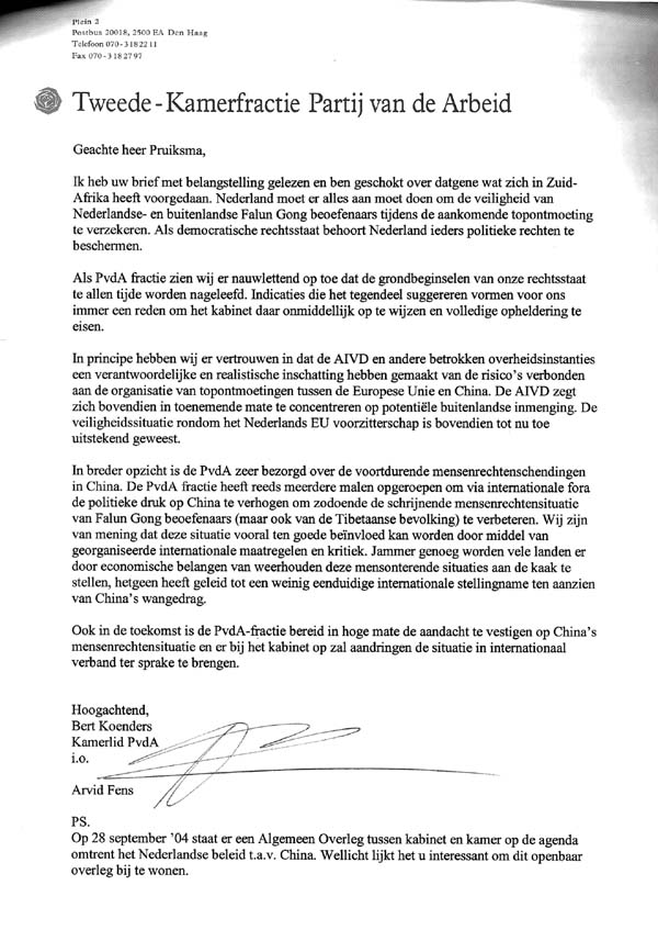 他表示,不管现在还是将来,工党都不会忽略关注中国人权情况的责任,并将不断要求荷兰内阁将这一议题在国际会议上提出来。