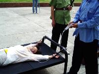 ![]() 金子容子在向民众说明自己所遭受的“死人床”酷刑 | ![]() 真人演示的“死人床”酷刑 | ![]() 日本学员在向民众介绍“死人床”酷刑 |