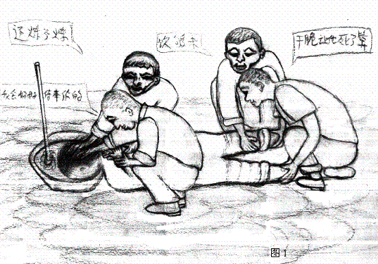 暴徒们经常揪起我的头发,使双脚近乎离地后猛速地将我的头在空中旋转,这样我被它们转得昏昏沉沉之时头发也被抓掉一部分,但当脚跟刚着地,气还没喘过来之际,它们又将我按倒在地上,把我的头压入厕所盆里灌水[见图1],在水中我因不能呼气造成多次窒息昏迷过去。