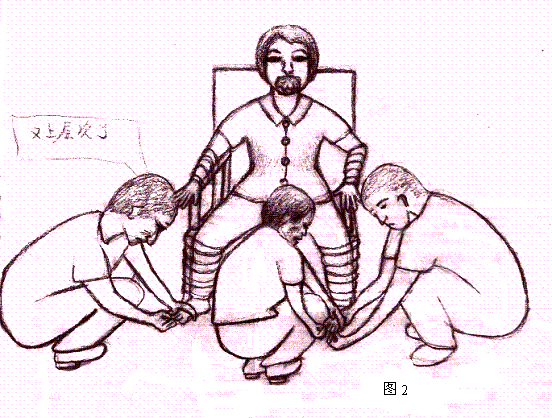 就这样暴徒们对我使用了新的酷刑折磨。邱朝华指使几个暴徒将我按在一张有扶手的椅子上,然后将我的双手、双脚各捆绑在椅子两边的扶手和椅子下前面的两个支脚上,再用一条脏毛巾把我的嘴塞住(怕我发出惨叫声)。随后几个暴徒拿竹签插入我脚趾甲和皮肉中,竹签在里面摇动 [见图2] 。