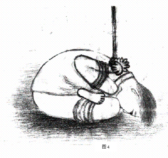 几天后,房间监管人员吴小红(女)将我骗到洗脑班的十楼,这里有两所监房,站在监房前,吴小红说,你想清楚了吗?如你不“转化”,你熬得过今天,熬不过明天,它们看我还是不肯“转化”,就来了几名“协管”恶徒,其中有袁玉萍(女)、车迎春(女)、陈玉燕(女)、吴金霞(女)等人,强行将我按坐在监房的地上,将我双腿盘起,双手反扭在身背后,再把我上身强行叠在被盘起的双腿上捆成一团 [见图4] ,其间恶徒袁玉萍在我的身后抓住我已被反扭在身后的双手的各手腕处使劲狠毒把我的双手背相互积压后捆绑在身背后,最后又从监房顶吊下来一条布条吊起捆在我身背的双手,使我的身体刚着地,经它们这番折磨后,我右手掌和手背的肌肉失去了知觉、麻痛,5个月后才得到恢复。