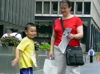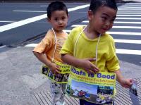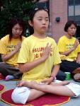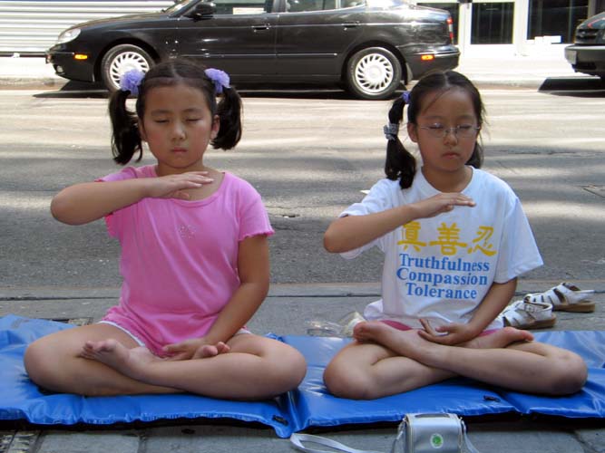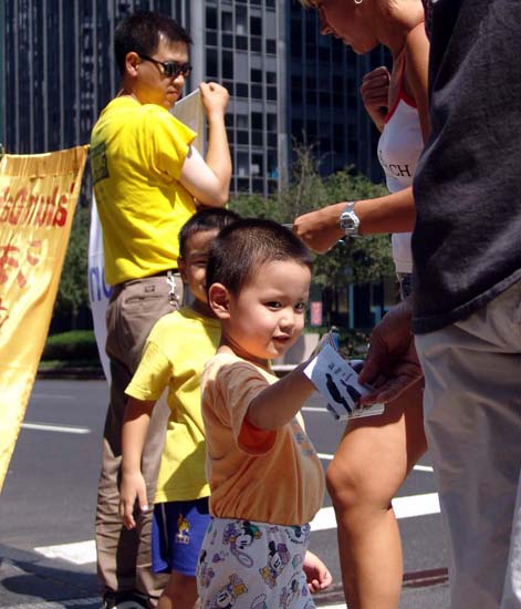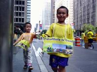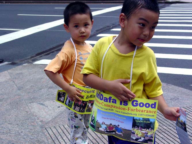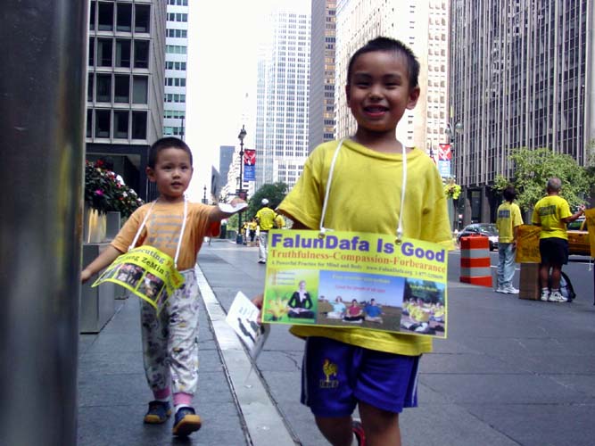 【明慧网2004年9月3日】2004年8月的最后一个周末,共和党全国代表大会召开的前夕,千余名法轮功学员出现在纽约曼哈顿街头熙熙攘攘的人流之中,其中不乏法轮大法的小弟子们,他们跟着爸爸妈妈来到曼哈顿,不辞辛劳,不畏酷暑,发传单、讲真象、表演祥和的五套功法,为救度世人而奔忙。