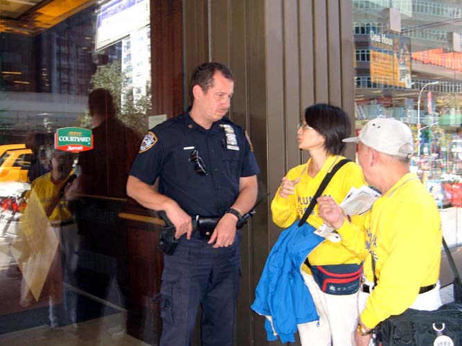 22日上午参加完集体炼功后,当我们的学员急匆匆的过马路时,一位值勤的警察把她们叫住:“嗨,法轮,回来!”他问学员:“你们是哪里来的?”学员回答说:“我们是多伦多来的。”警察说:“加拿大?我很喜欢加拿大。如果可以的话,我很想到那居住。我也很想学你们的法轮功。”后来学员给他介绍了网址。他说他会到网上去下载《转法轮》来读。