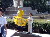 21日中午,在中央公园酷刑展旁边学员休息的地方,来了一位身穿笔挺西装、神情庄重的先生。他非常慎重的问一位学员:“你告诉我,我能帮你们做些什么?”这位学员就把正在取资料的符泳青拉到那位先生面前说:“她是美国公民李祥春的未婚妻,李祥春现正在中国的监狱里受着折磨。她正需要帮助。”这位先生就转向符泳青说:“李祥春,美国公民,我知道,你们的情况我都很清楚。我来这的目地是想问你们,我具体能帮你们做点什么?”符泳青真诚的对他说:“首先谢谢你的诚意。我个人不会要求你为我做什么。因为这是江氏发起的一场对全人类的迫害,而不仅仅是我未婚夫的事情。”这位先生紧接着说:“正因为它是对全人类的迫害,而我也是人类的一分子,也就是说它也可能在迫害着我,我才想站出来为反迫害尽我的一份力量。”他的正义感令人感动。