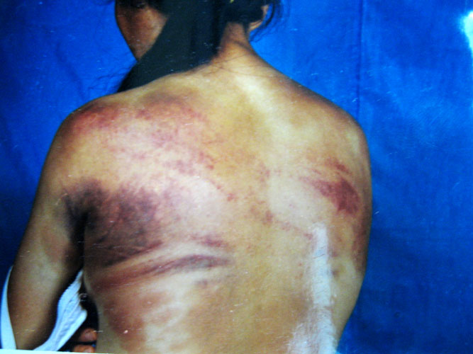 到了那里,它们就把我推向小屋,让我给它们跪下,我说我犯的什么罪,你们这样对待我,它们就恶狠狠的把我踹跪下,连打带骂的说你老公爹看不起我们,我让你不老实。打了好大一阵儿,然后就又让我出去上院子当中,那有一棵大树,就把我吊起来,手还依然铐着,连打带骂的说人家都上北京去,你为什么不去,你去了好让你去劳教,就这样一直吊着打,还用管子往我身上浇水,往我的脸上浇水,让我说。我问它们让我说什么,它们说你不是学真善忍吗,我说是啊,我没有错。它们说我嘴硬,就把着我的头把水往嘴里浇,还用橡胶棒打我全身,打的不像样子,就这样在那里吊了好几天,最后它们才通知家里人拿500元钱交给它们才让我回家。