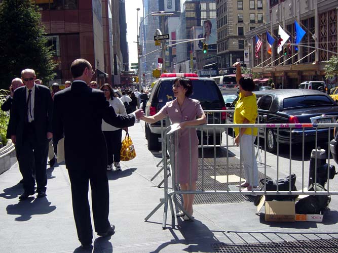傍晚,要离开时。站在街角等同修的车子过来接我。又遇一队CNN的记者。就上前与他们攀谈。问他们:有没有注意到这一次共和党大会期间,曼哈顿到处都是法轮功学员?你们为什么不报道我们?一位记者很聪明的赶紧接话,“我们从前有报道的,在国际频道,你们也许没有看见。”他说,这一场迫害已经進行了几年了,他们知道的。
