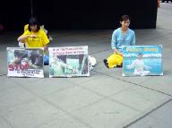 等到十点半钟,约好的几位同修来了。我们三位一组在街角上站定。一位美国同修发资料,一位中国同修举着一个标语“请帮助停止对法轮功的迫害”,我则坐下来发正念,炼功。