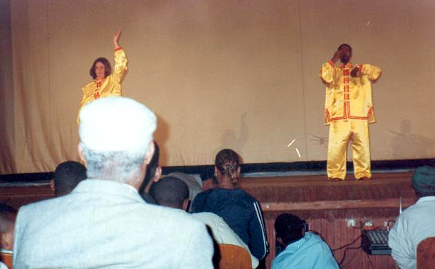 另外,学员们受当地一所武术学校邀请参与其年度公开表演。活动在市里一家有名的艺术表演厅里举行。我们演示功法并发放传单。现场大约有一千名观众。
