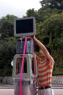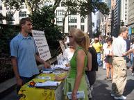 法轮功学员在纽约街头以一种特殊方式在抵抗江氏集团对法轮功真象的媒体封锁。