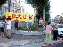 为支持和配合更大范围“大法洪传台湾大街小巷”的洪法讲真象的形式,台湾内坜地区在2004年9月3日星期六下午,明慧学校小弟子与内坜同修约三十多人,各找了人潮较多的公园和黄昏市场,配合全省同步从5:00-6:10结合户外炼功、洪法、讲真象、发正念的活动,一起出来户外洪法炼功。