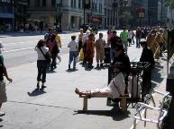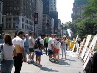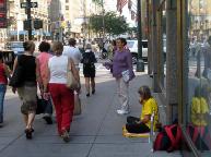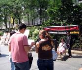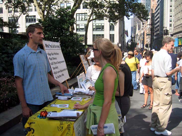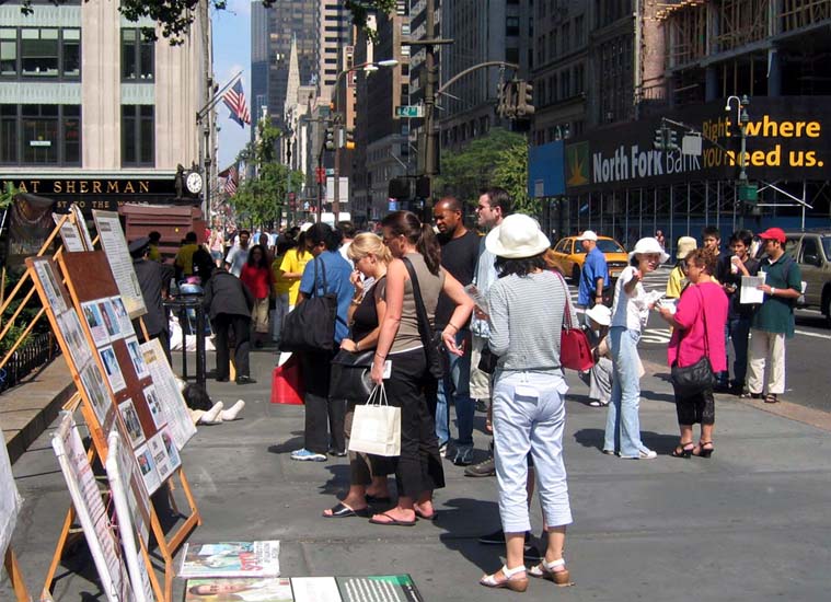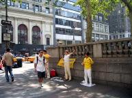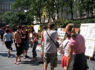 【明慧网2004年9月6日】(明慧记者曾洪纽约报道)周末曼哈顿市区的街头一如既往的热闹非凡,来自各地的法轮功学员也继续在曼哈顿的多个繁华、人流大的地方举办酷刑展,讲清真象,救度世人。