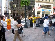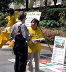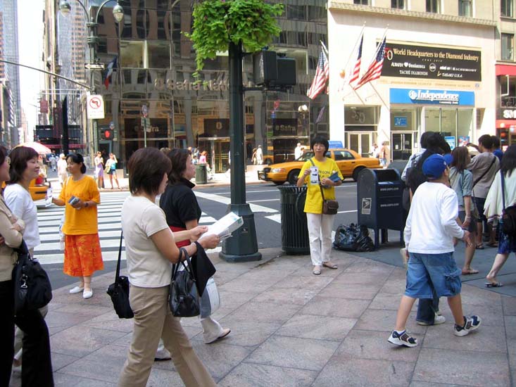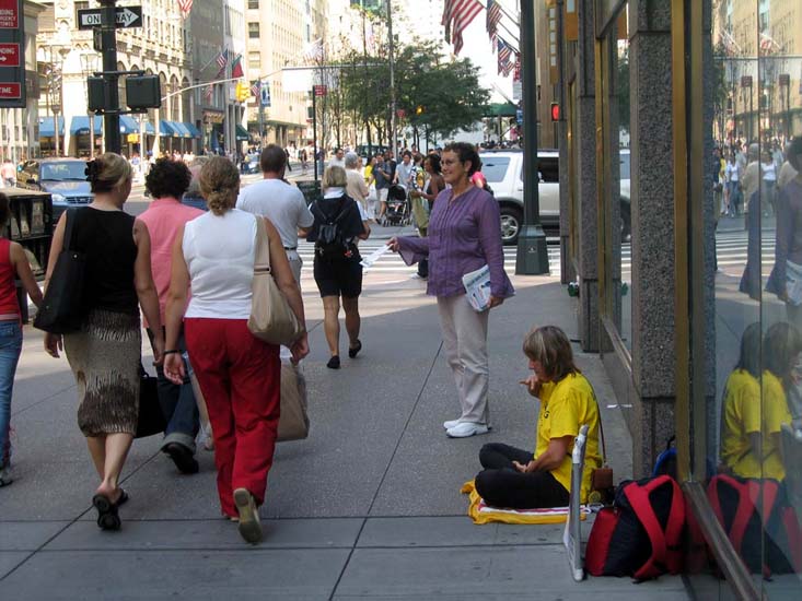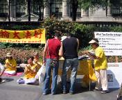 其它地区的许多法轮功学员也利用周末长途赶来纽约讲真象,身着黄色的T恤衫的法轮功学员遍布了附近的街道,他们有的在炼功,有的在发真象传单;也可看到许多路人都是手里拿着法轮功的真象传单在街上行走,再遇到学员给他们资料时,他们说,我已经拿了你们的资料了。有的说,我知道了,这迫害太残酷了。当然,就象以往一样,法轮功学员都会碰到想学法炼功的有缘人。一位路人当街认真学习了五套功法后,满意的离去。