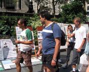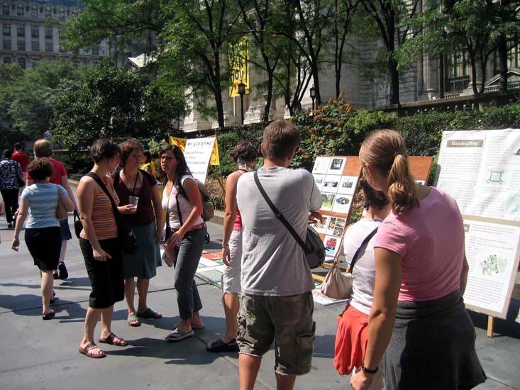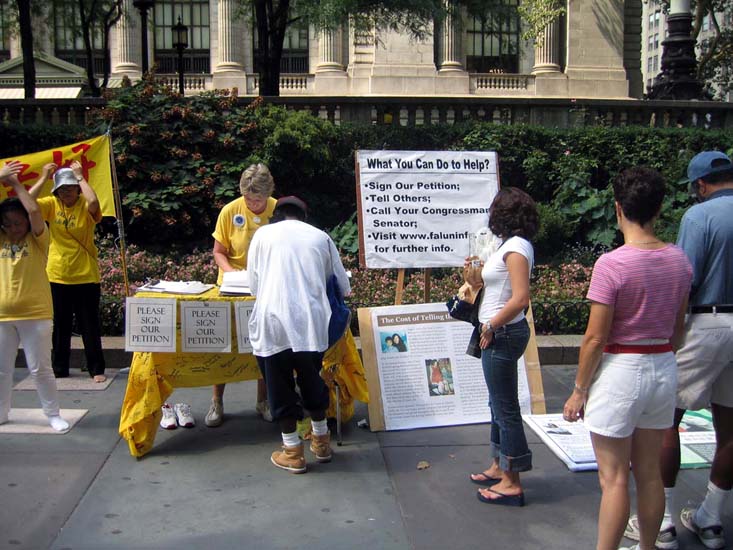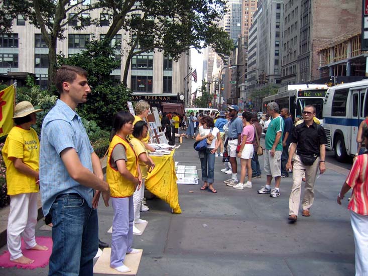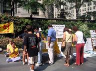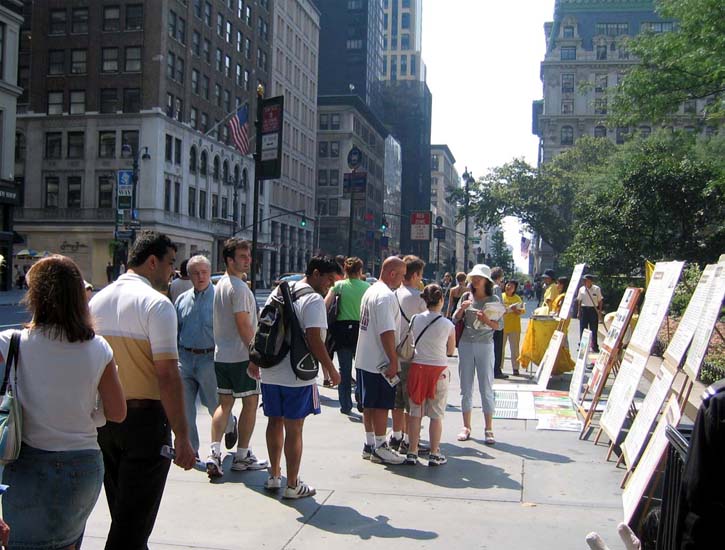 在42街一块宽敞的地带,学员们在这里架起了真象看板和签名的台子,这两旁一边是真人模拟酷刑展,一边是几位法轮功学员在烈日下演示着舒缓、平和、优美的功法。强烈的反差吸引了过往的人们的目光,他们许多人都停下匆忙的脚步,问这到底是怎么回事。