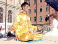 星期六,在庆典长达两个小时的节目中,有法轮功学员们用吉他、鼓和小提琴演奏的音乐“普度”,另一位学员还向民众简单的介绍了法轮功和发生在中国对法轮功的残酷及系统性的迫害。同时,在现场还有为民众及游客准备的三种语言的法轮功真象图片展。