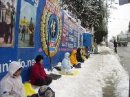 2005年1月8日下午,加拿大温哥华大雪纷飞,法轮功学员仍然冒着大雪,坚持在中领馆前发正念、炼功,过往车辆不断按喇叭致意,有的还专门停下车来摄下这珍贵的镜头。