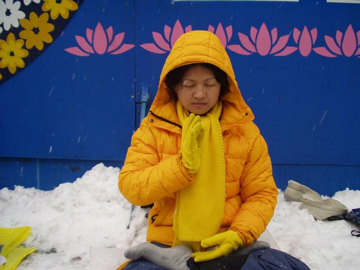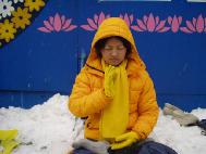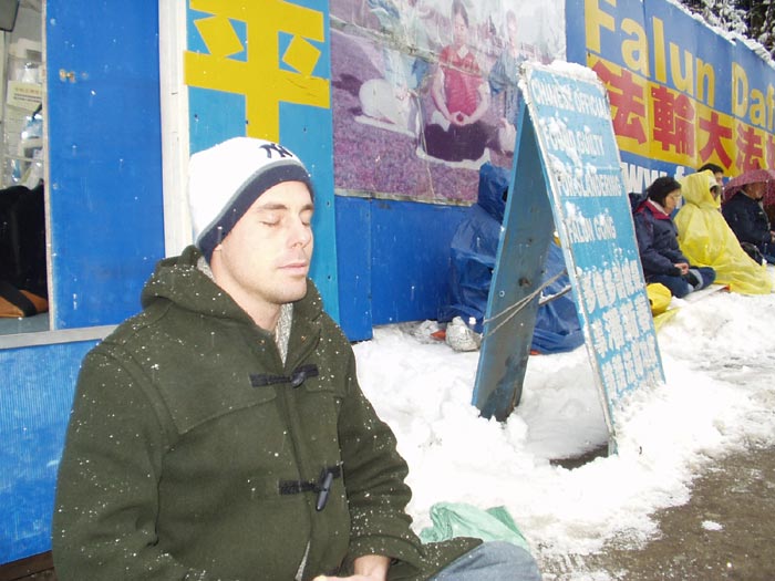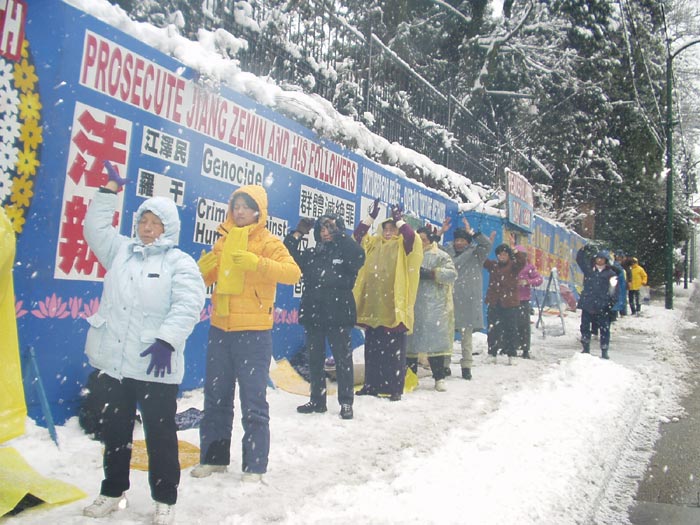 【明慧网2005年1月10日】(明慧记者李华温哥华报道)2005年1月8日下午,加拿大温哥华大雪纷飞,法轮功学员仍然冒着大雪,坚持在中领馆前发正念、炼功,过往车辆不断按喇叭致意,有的还专门停下车来摄下这珍贵的镜头。