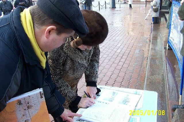 一名男士在展板前看了很久,然后走到过街道正准备过马路,可他却又返回来继续站在那里看,直到有学员过来给了他资料并向他進一步讲清了真象,他高兴的在征签簿上签了名后才离开。