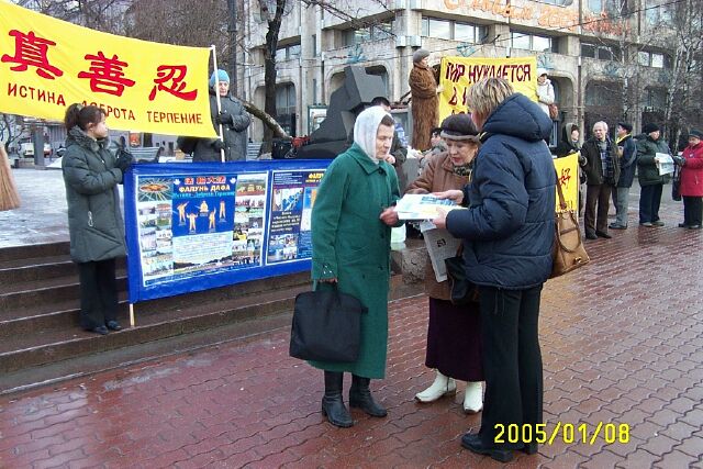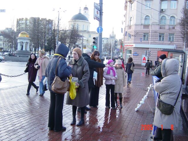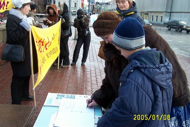 因为活动的地点正在俄罗斯塔斯社大楼旁边,学员安得列想把真象材料送進这个最大的俄罗斯通讯社。他首先向门卫洪法讲真象,送给门卫贺年卡和真象报纸,并進一步询问能不能放一些报纸到里面的桌子上,门卫稍犹疑了一下说:“那你就放吧”。这样,几十份真象报纸将会在星期一上班时传遍塔斯社大楼。